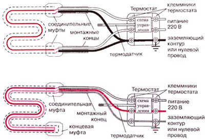 Рисунок 1. Схема подключения 1- и 2-жильного нагревательного кабеля